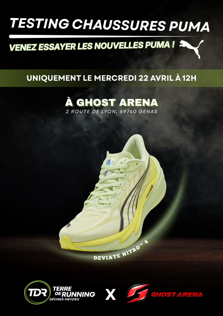 Ghost Arena organise un événement exclusif en collaboration avec Terre de Running Décines-Meyzieu, le mercredi 22 avril à 12h, au sein du club. À cette occasion, leur équipe se déplace directement à Ghost Arena pour proposer à nos adhérents un moment privilégié autour du testing produit et du conseil personnalisé. Les participants auront l’opportunité de tester la Puma Deviate NITRO™ 4 dans des conditions réelles d’entraînement, tout en bénéficiant de l’accompagnement de spécialistes du running. Cet événement s’inscrit dans notre volonté de proposer à nos adhérents des expériences complémentaires à l’entraînement, en collaborant avec des acteurs reconnus dans leur domaine.