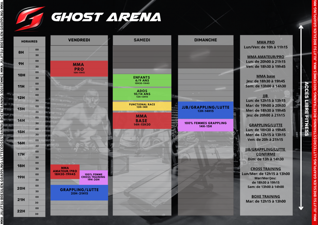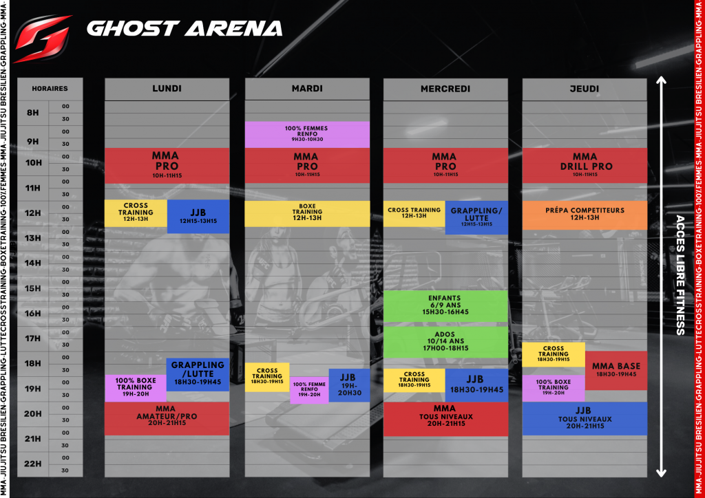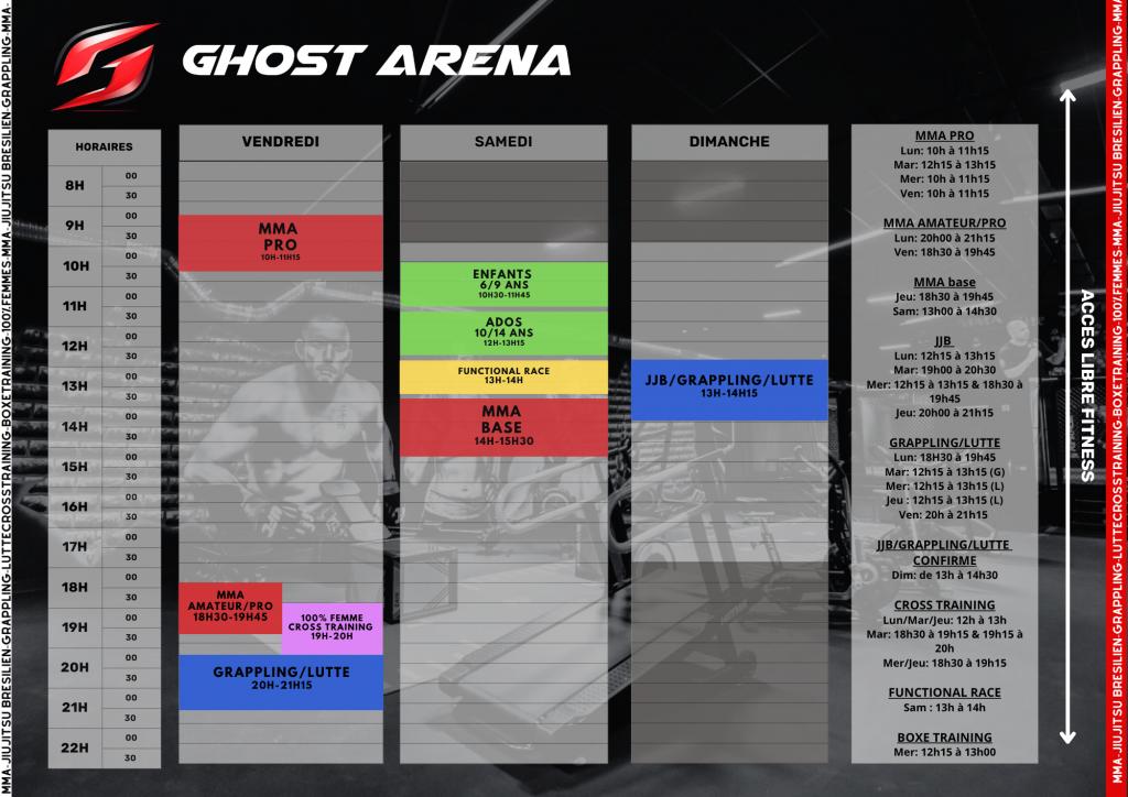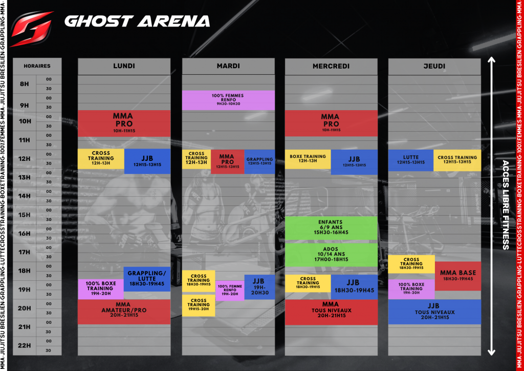 Bienvenue sur la page Tarifs & Plannings de Ghost Arena, votre salle de sport de référence pour atteindre vos objectifs sportifs à votre rythme et selon votre budget. Chez Ghost Arena, nous croyons en la flexibilité et l’accessibilité : c’est pourquoi nous proposons une gamme de formules adaptées à tous les niveaux, du débutant au sportif confirmé. Que vous cherchiez un abonnement mensuel, des séances à la carte ou des offres spécifiques (entreprises, etc.), vous trouverez une option qui correspond à vos besoins.